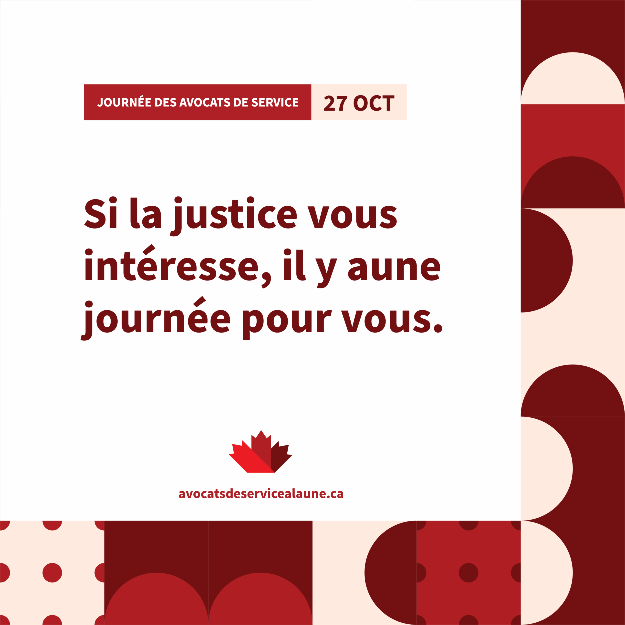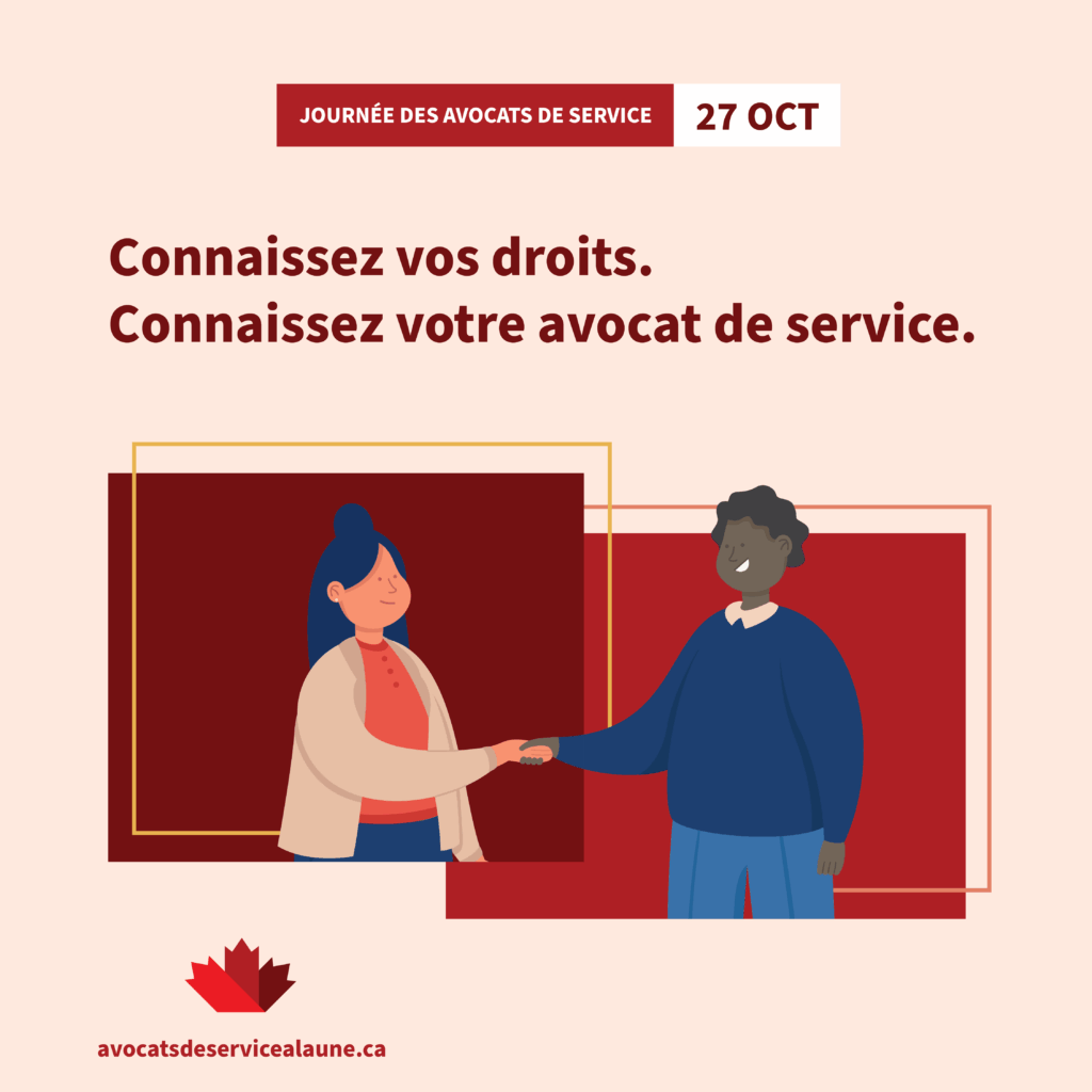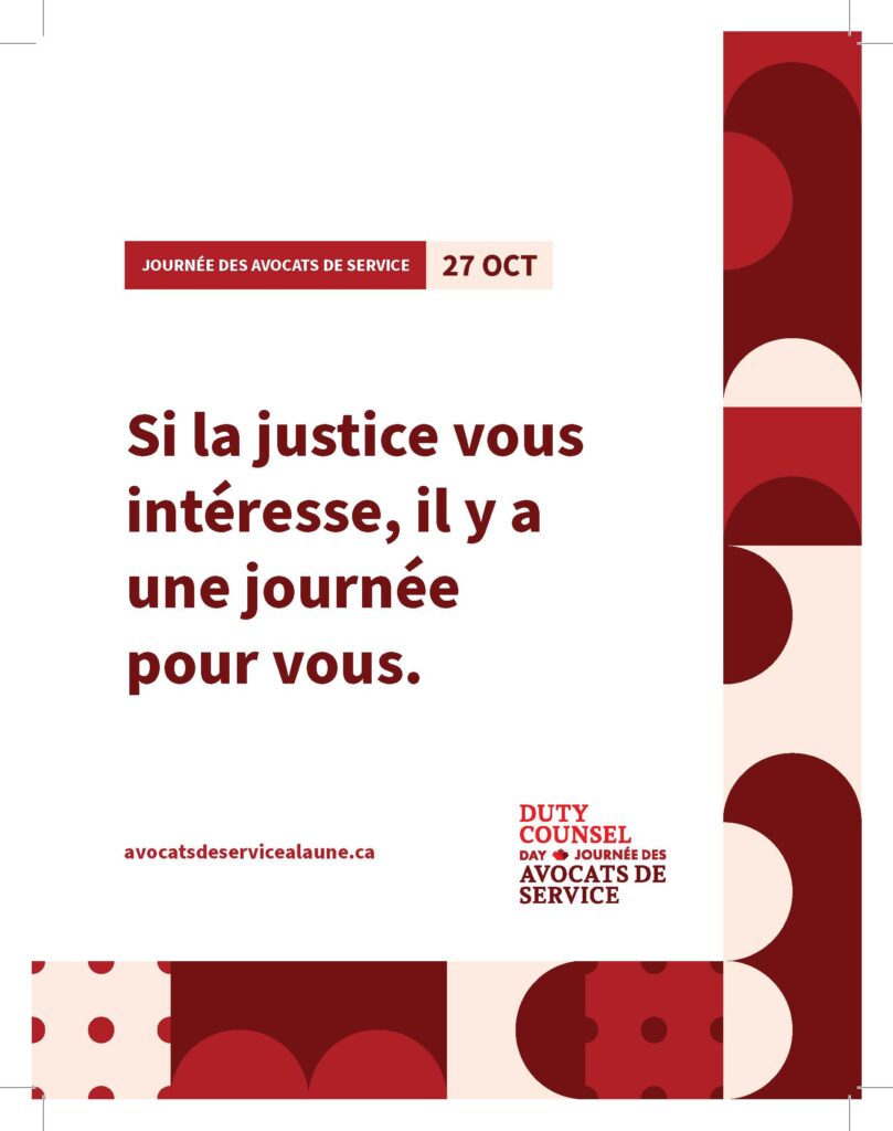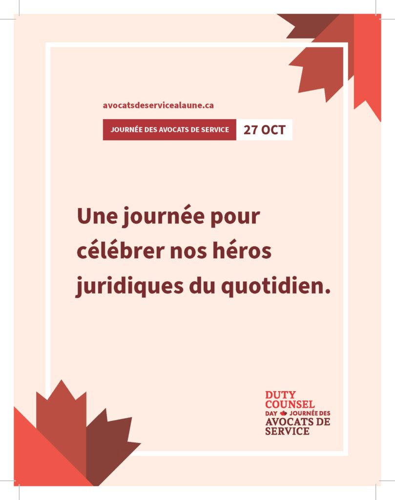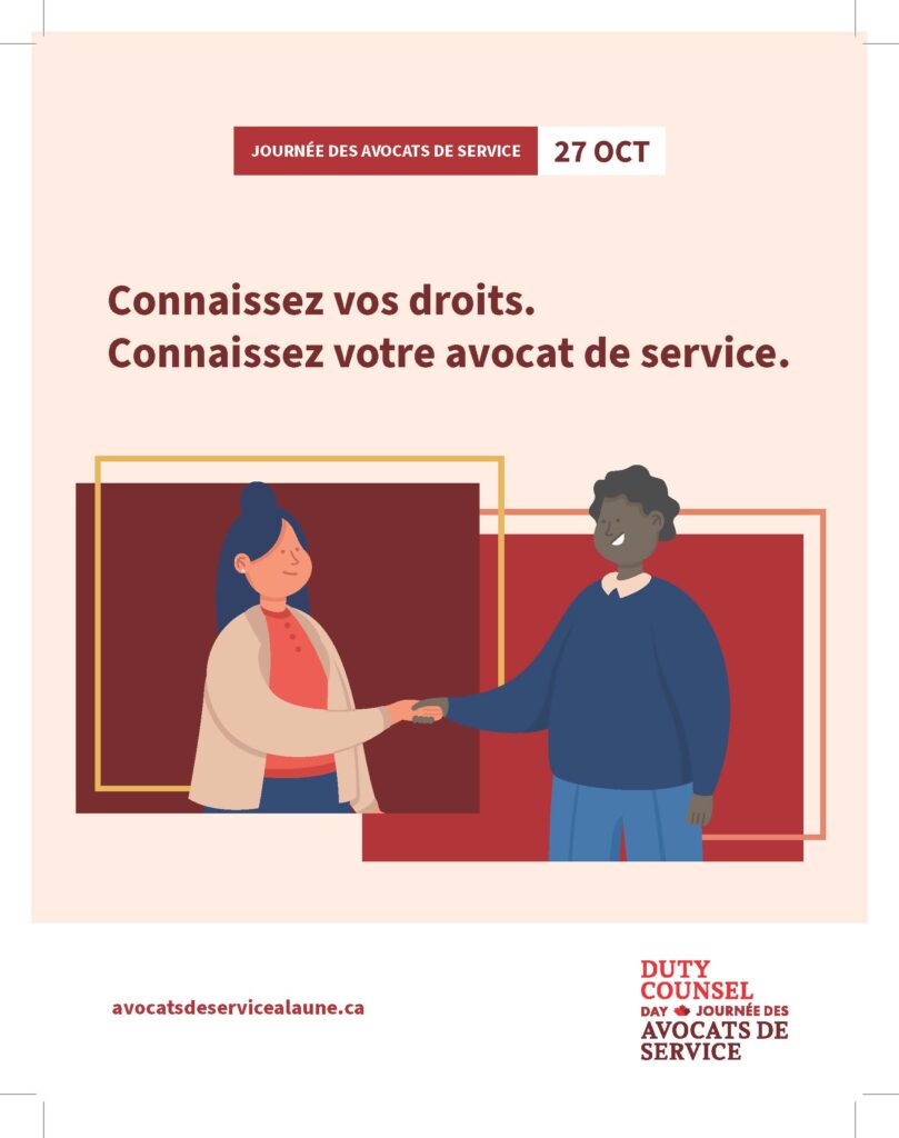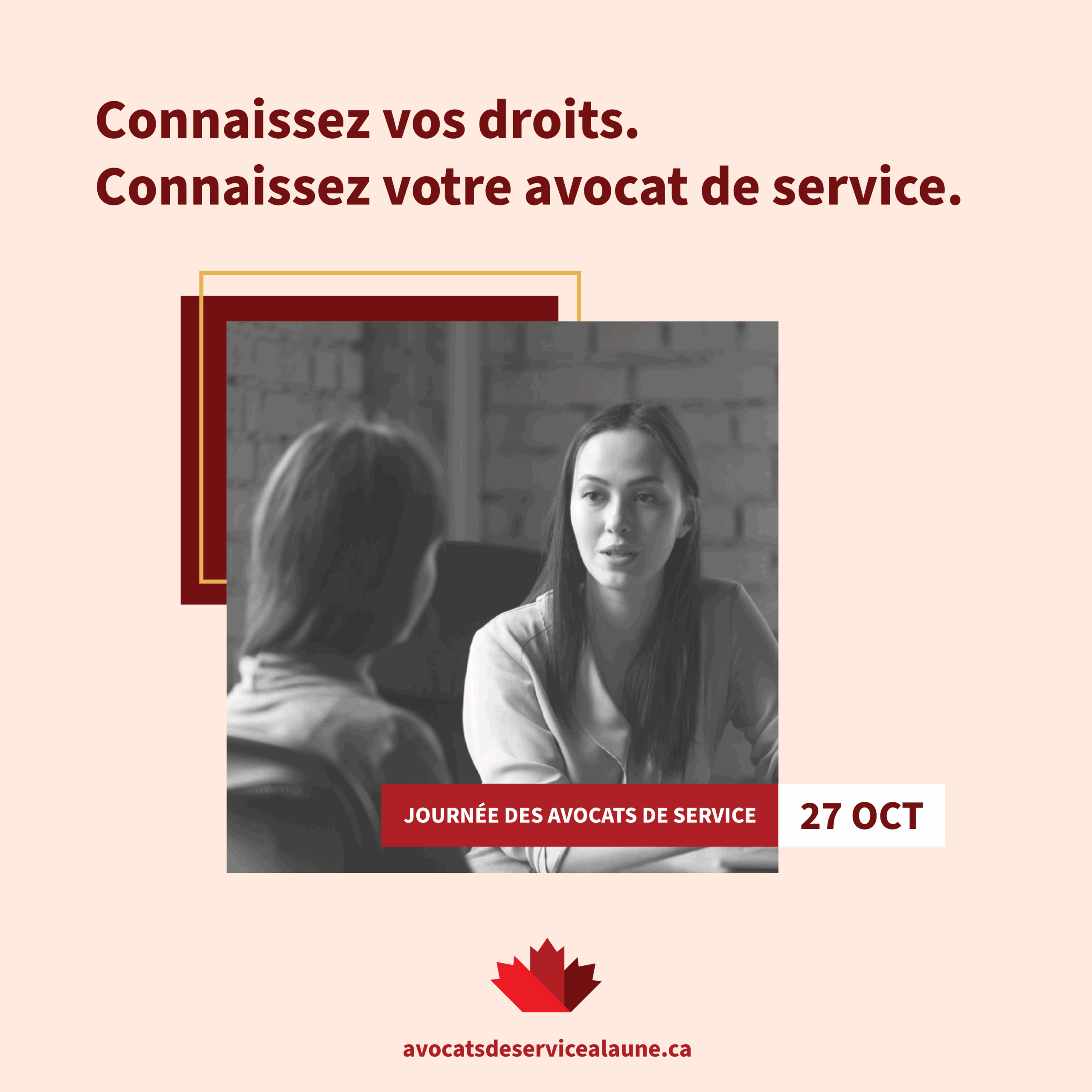 “Si vous aimez la justice, j’ai une journée pour vous. Il est important que nous connaissions nos droits garantis par la Charte et comment les exercer. Le 27 octobre, je me tiens aux côtés des avocats de service, des avocats de l’aide juridique qui défendent nos droits. Vous le pouvez aussi. savoirdevoirconseil.ca #knowdutycounsel #dutycounselday #accesstojustice”