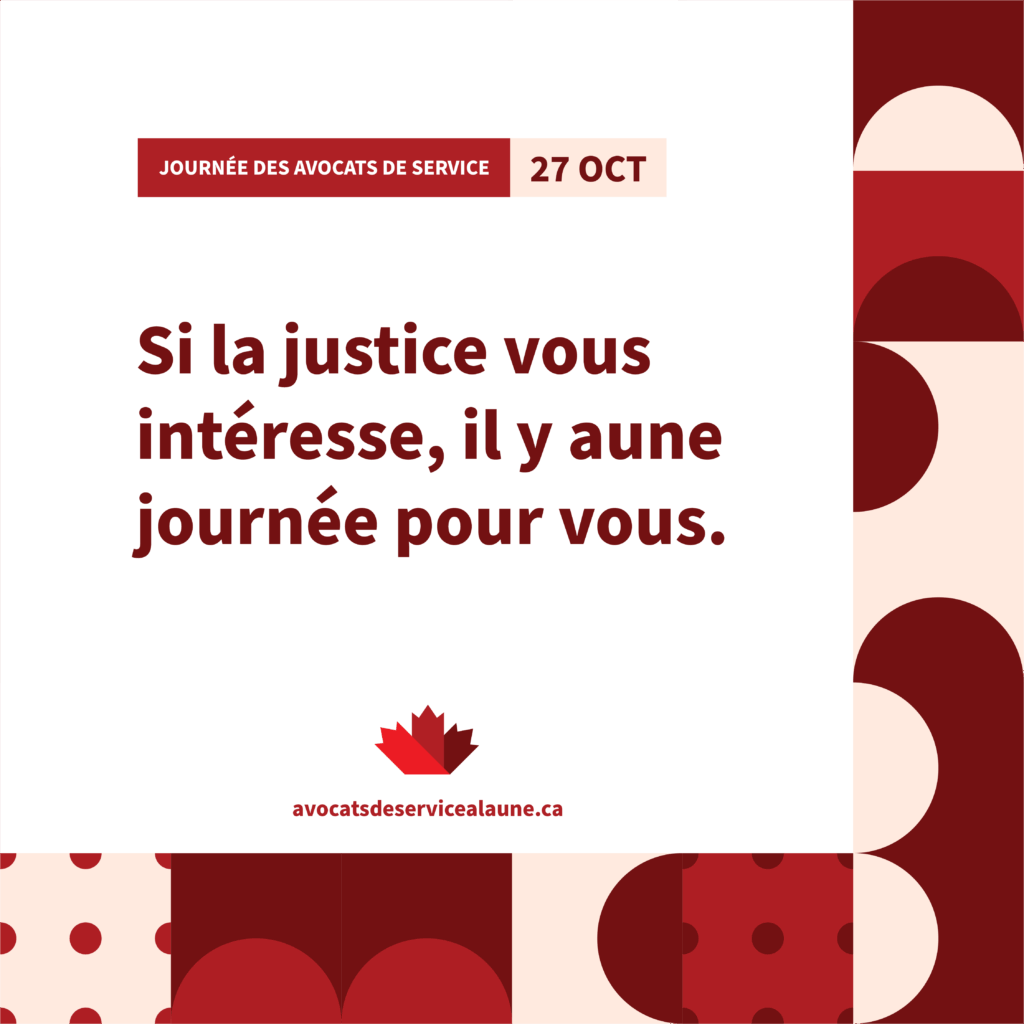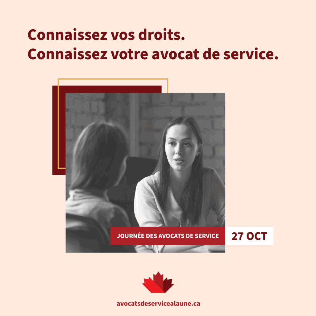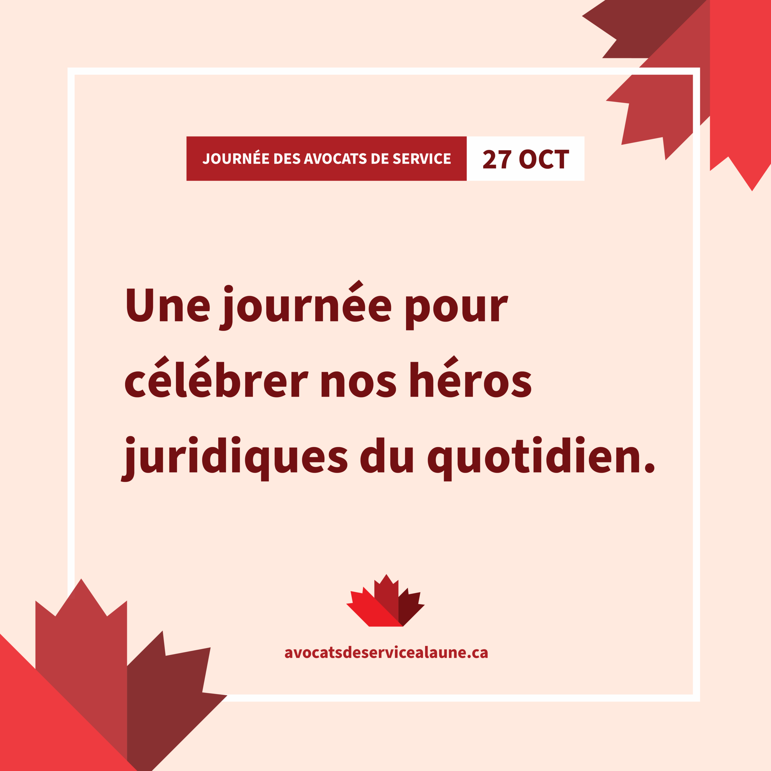 Parlez-en autour de vous. Ci-dessous, vous trouverez des ressources que vous pouvez utiliser pour promouvoir la Journée des avocats de service.